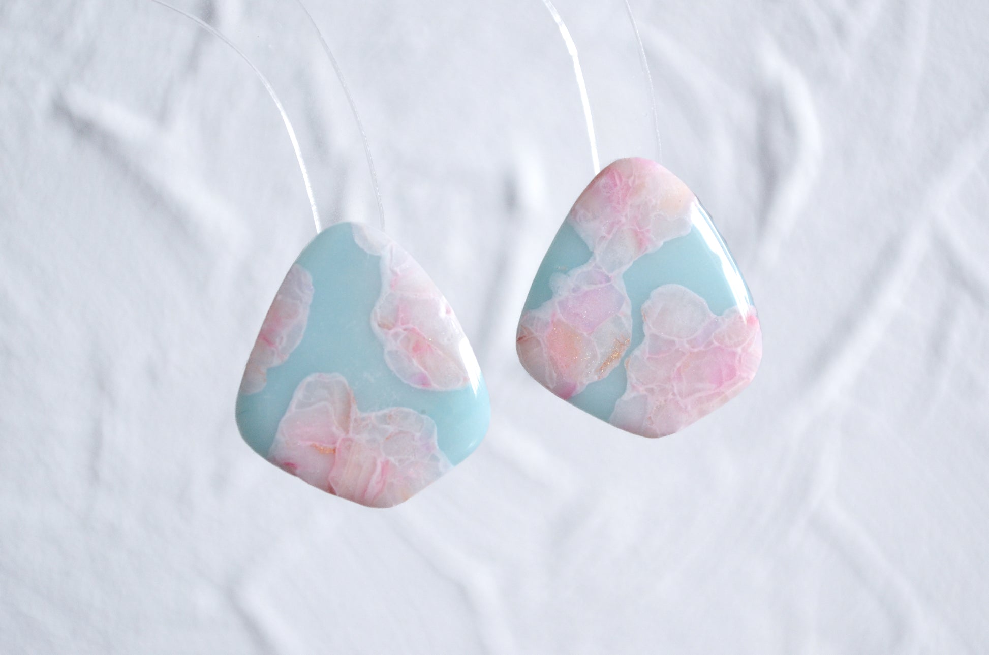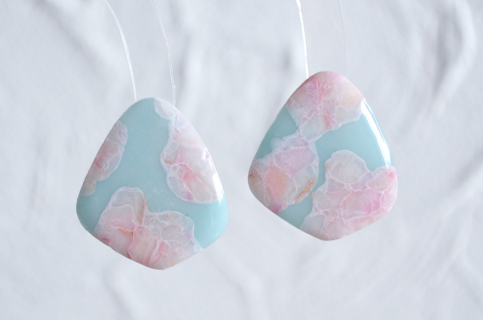 Cerceii îmbină nuanțe pastelate de albastru deschis și accente roz pal. Ambele fețe sunt acoperite cu rășină UV, pentru a oferi un finisaj lucios și un plus de protecție. Au o formă simplă geometrică, ceea ce îi face perfecți pentru a fi purtați zi de zi.