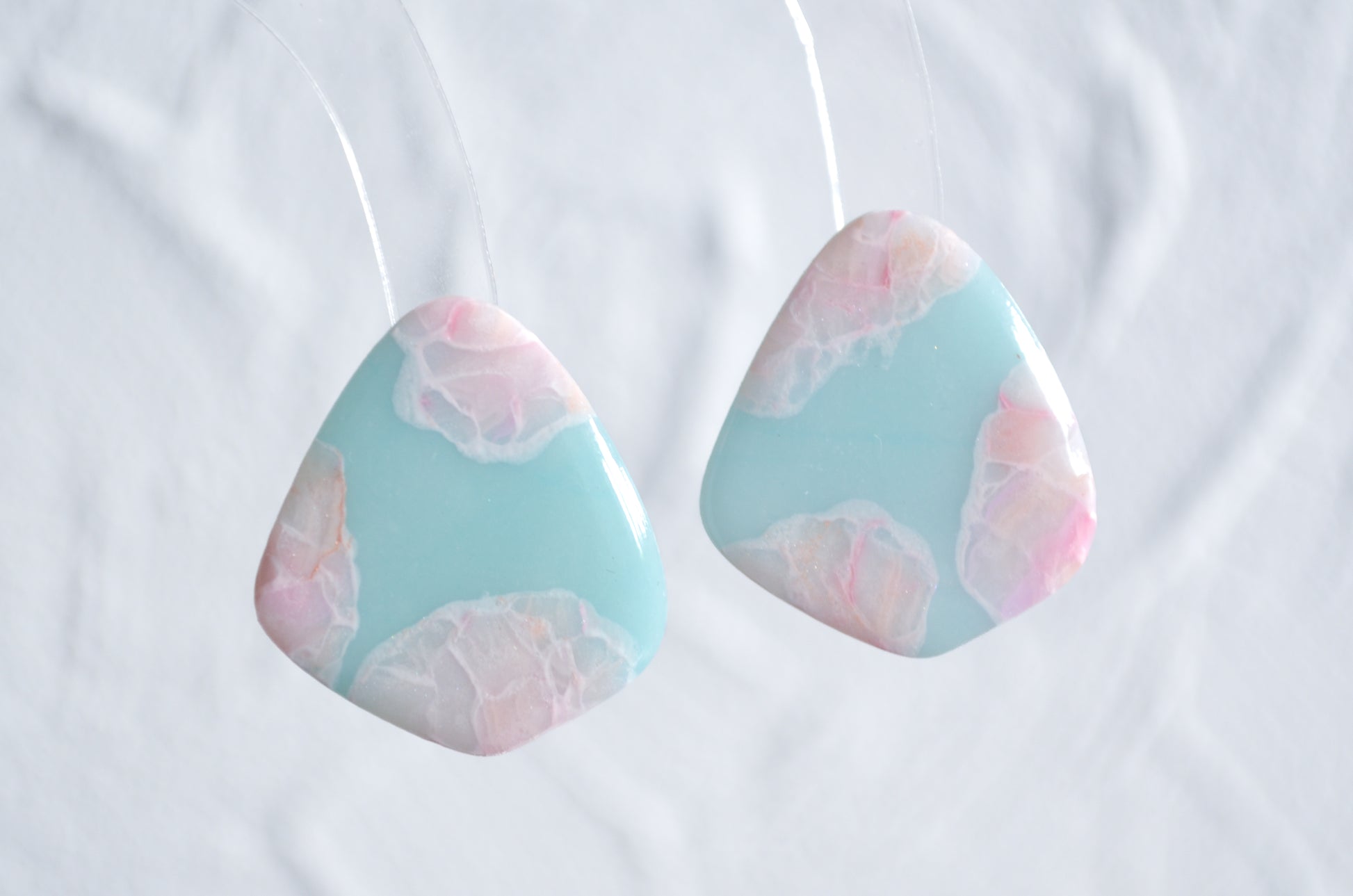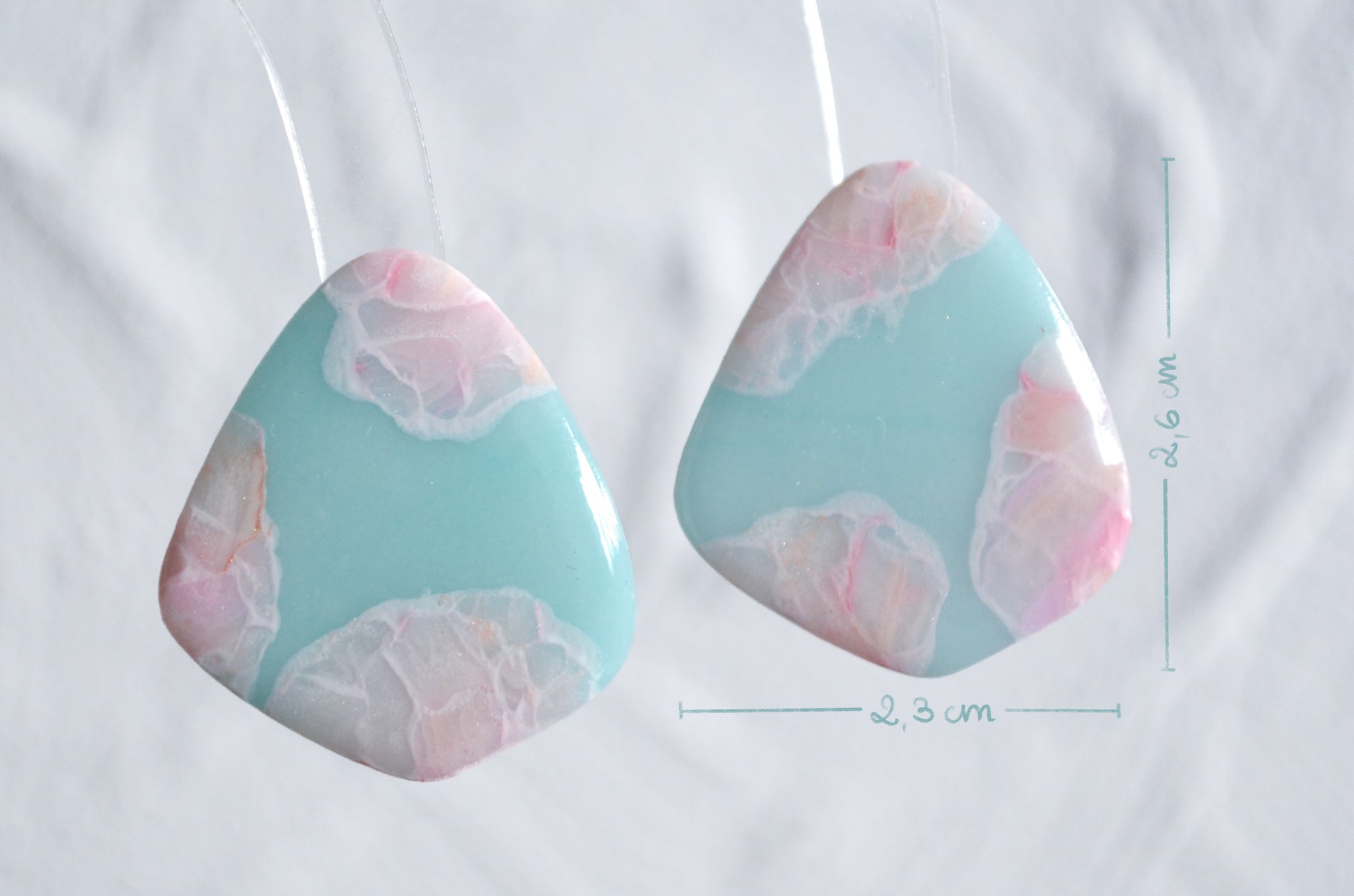 Cerceii îmbină nuanțe pastelate de albastru deschis și accente roz pal. Ambele fețe sunt acoperite cu rășină UV, pentru a oferi un finisaj lucios și un plus de protecție. Au o formă simplă geometrică, ceea ce îi face perfecți pentru a fi purtați zi de zi.