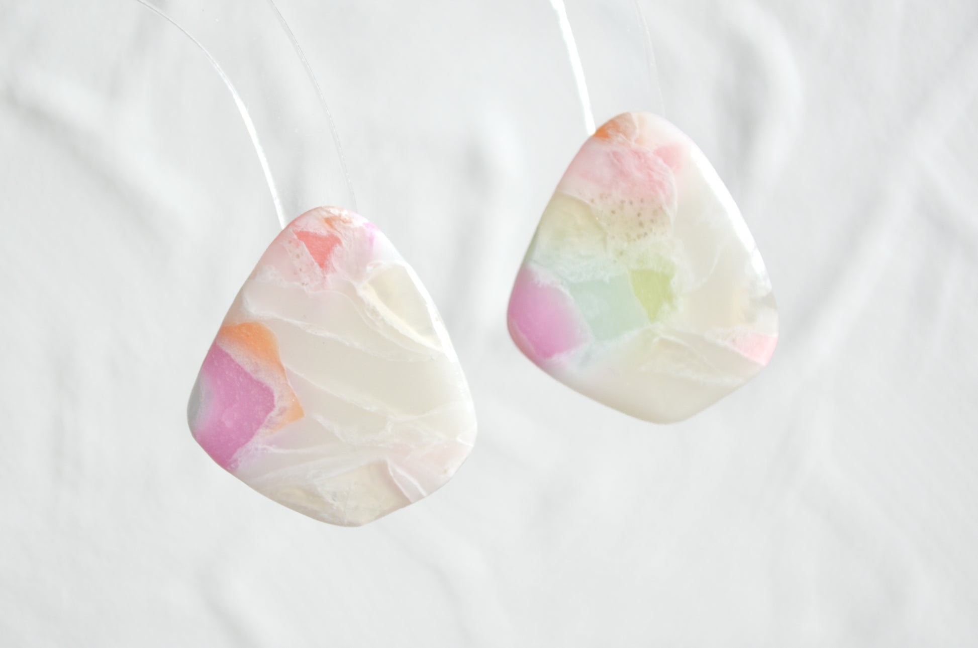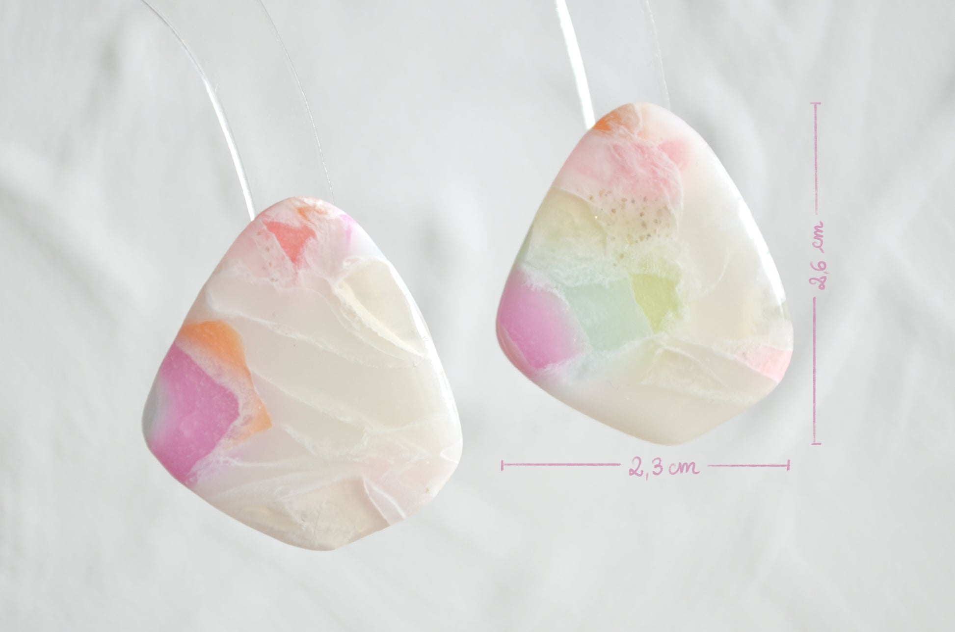 Cerceii au o bază albă, ușor translucidă, cu accente vibrante de culoare, asemănătoare unui curcubeu. Ambele fețe sunt acoperite cu rășină UV, pentru a oferi un finisaj lucios și un plus de protecție. Având o dimensiune medie și o formă simplă, sunt potriviți atât pentru a fi purtați zilnic, cât și pentru ocazii speciale. Sunt o alegere perfectă, fie că vrei să îi adaugi colecției tale, fie că vrei să îi faci cadou.