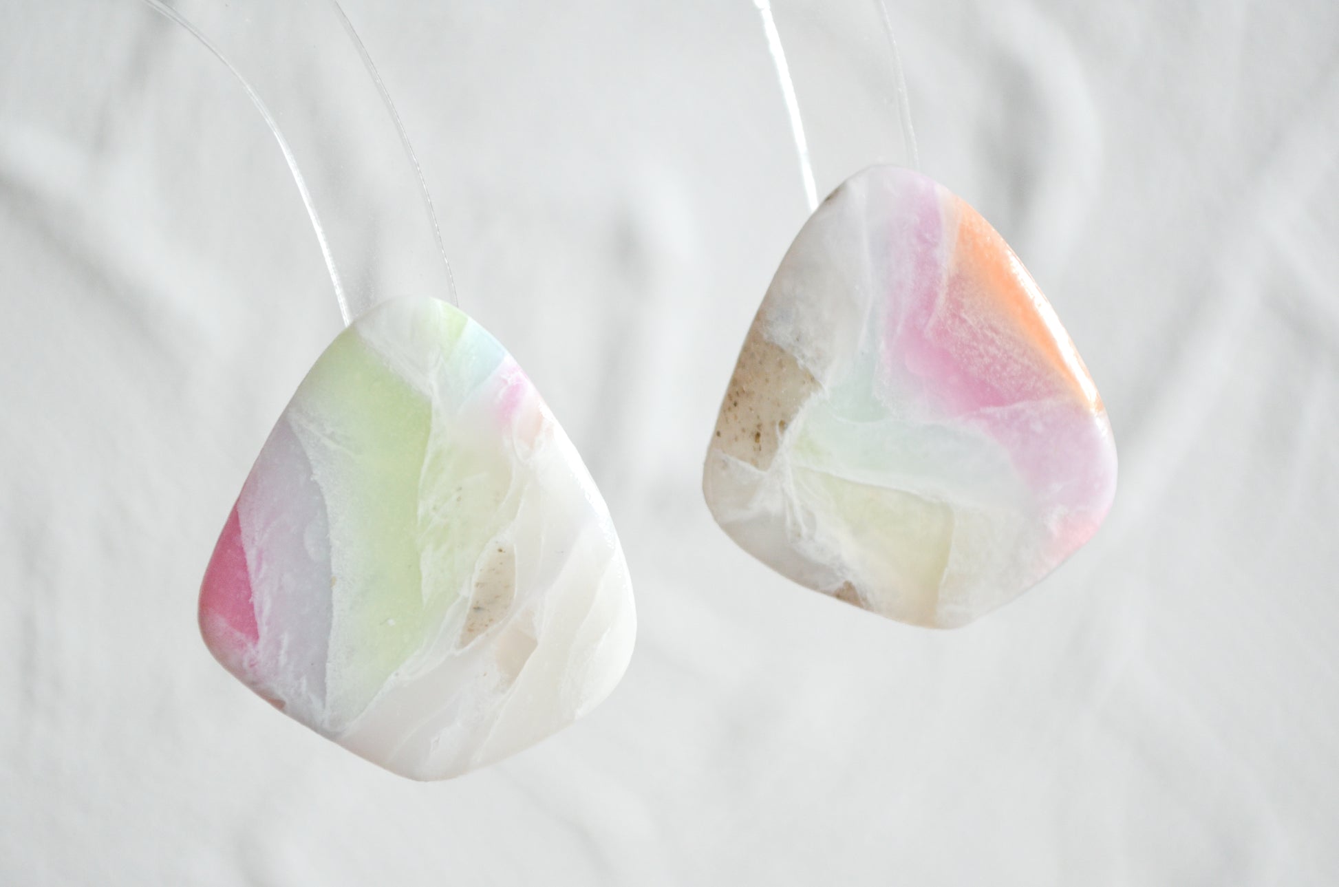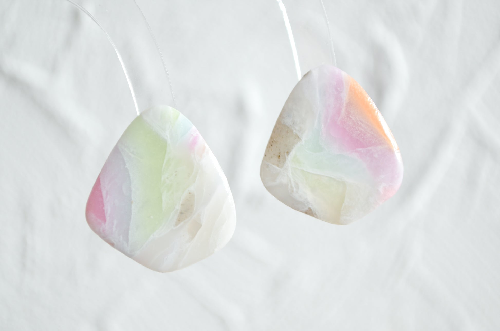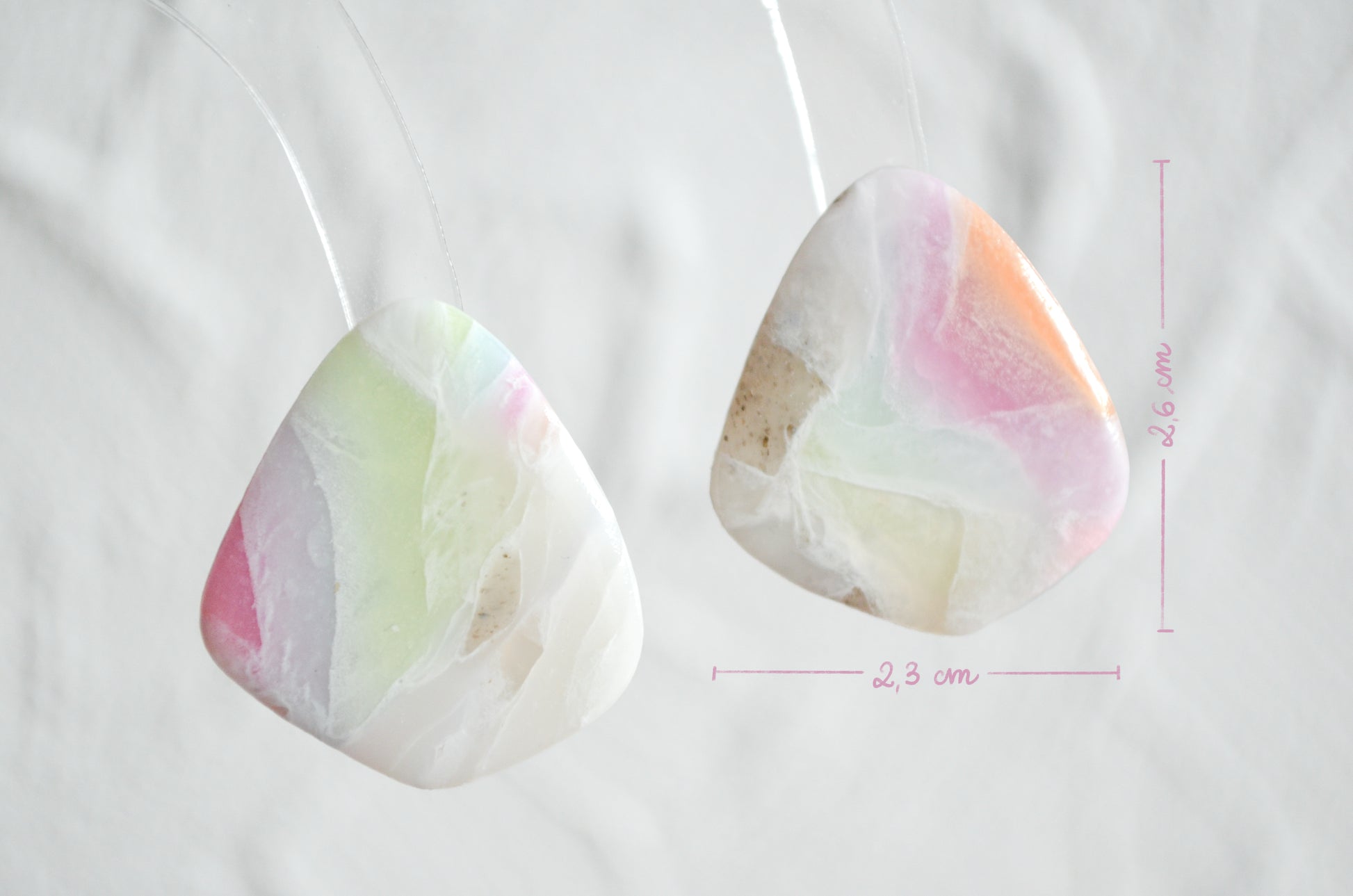 Cerceii au o bază albă, ușor translucidă, cu accente vibrante de culoare, asemănătoare unui curcubeu. Ambele fețe sunt acoperite cu rășină UV, pentru a oferi un finisaj lucios și un plus de protecție. Având o dimensiune medie și o formă simplă, sunt potriviți atât pentru a fi purtați zilnic, cât și pentru ocazii speciale. Sunt o alegere perfectă, fie că vrei să îi adaugi colecției tale, fie că vrei să îi faci cadou.