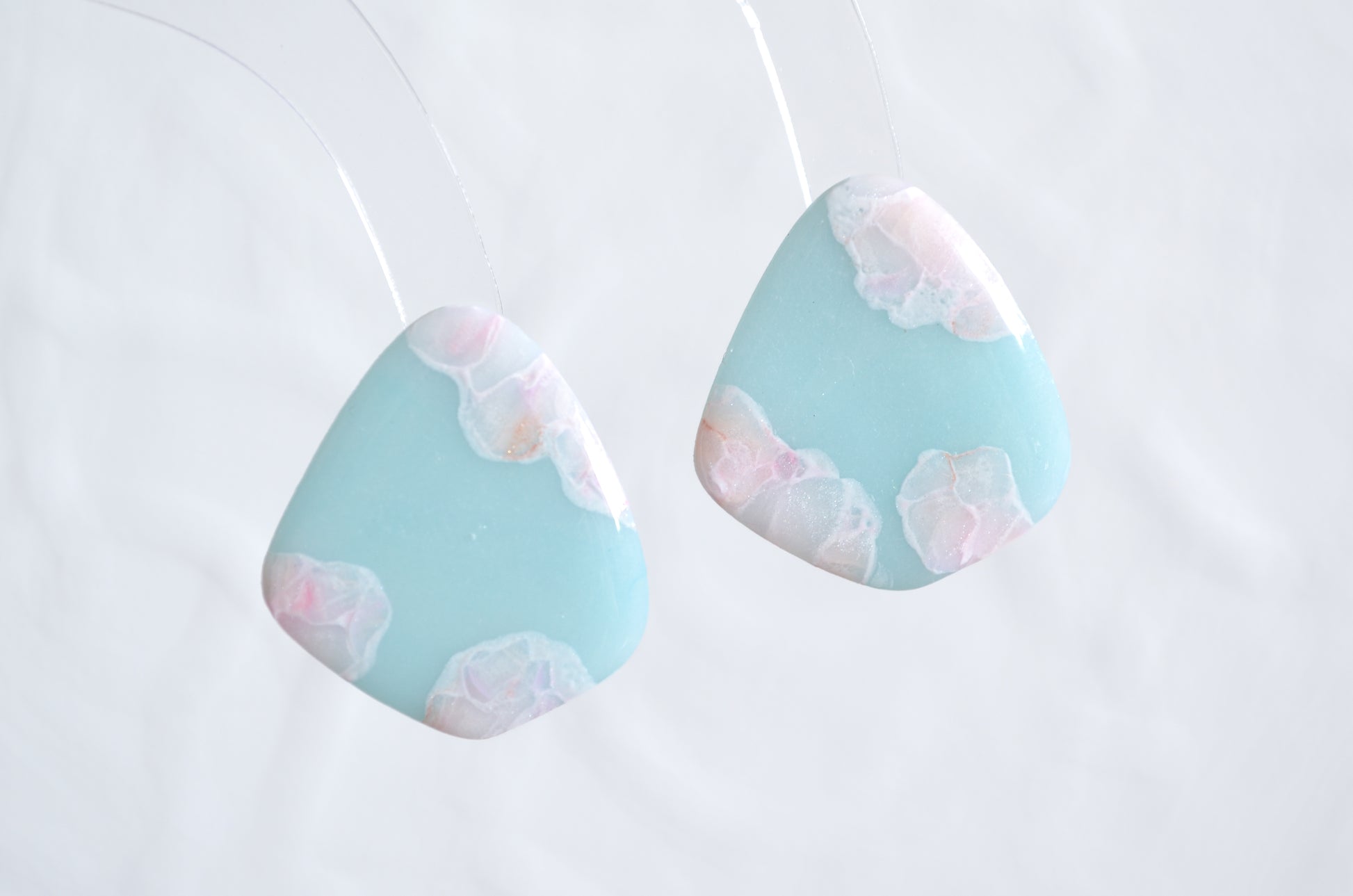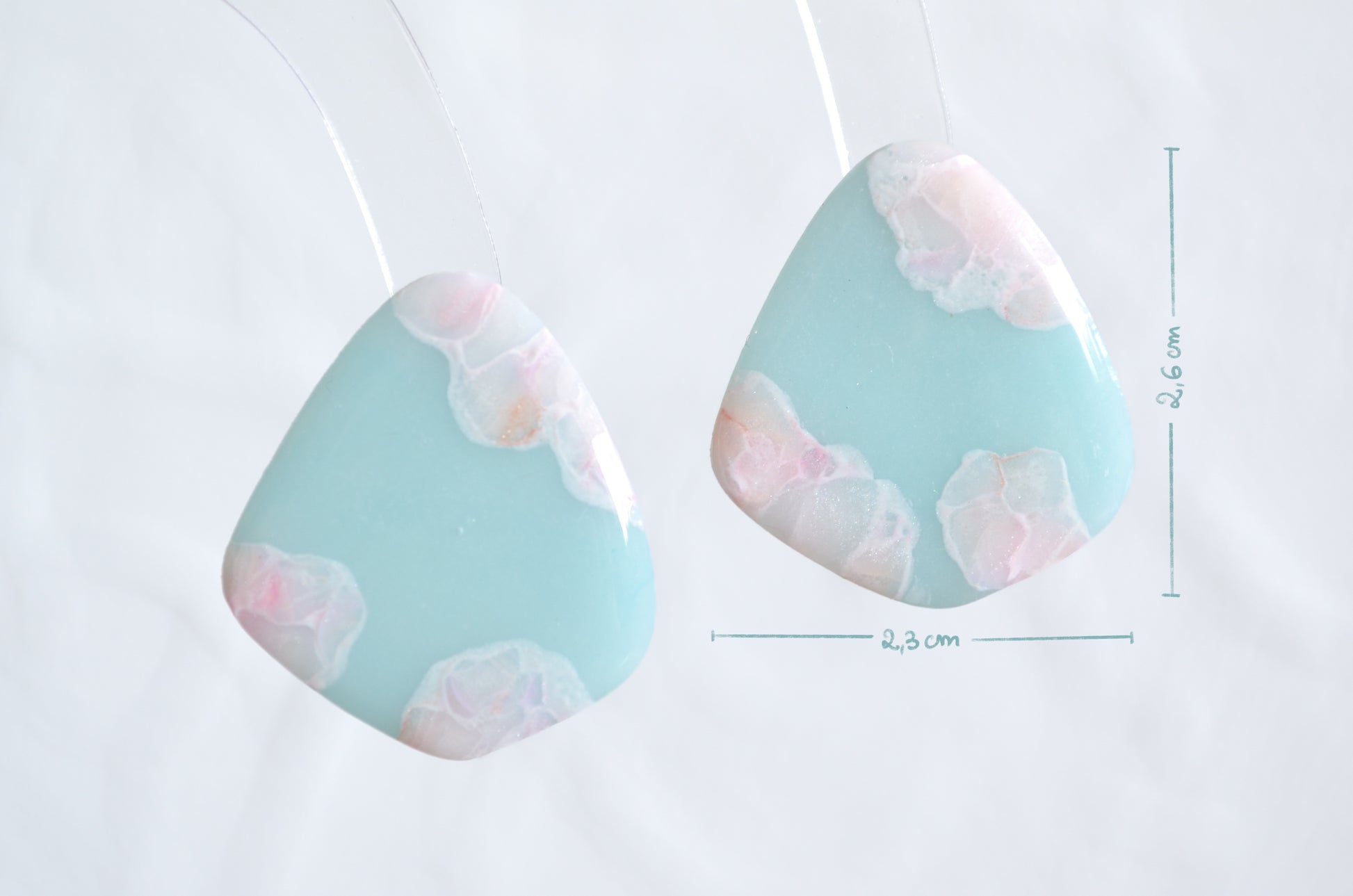 Cerceii îmbină nuanțe pastelate de albastru deschis și accente roz palAmbele fețe sunt acoperite cu rășină UV, pentru a oferi un finisaj lucios și un plus de protecție. Au o formă simplă geometrică, ceea ce îi face perfecți pentru a fi purtați zi de zi.