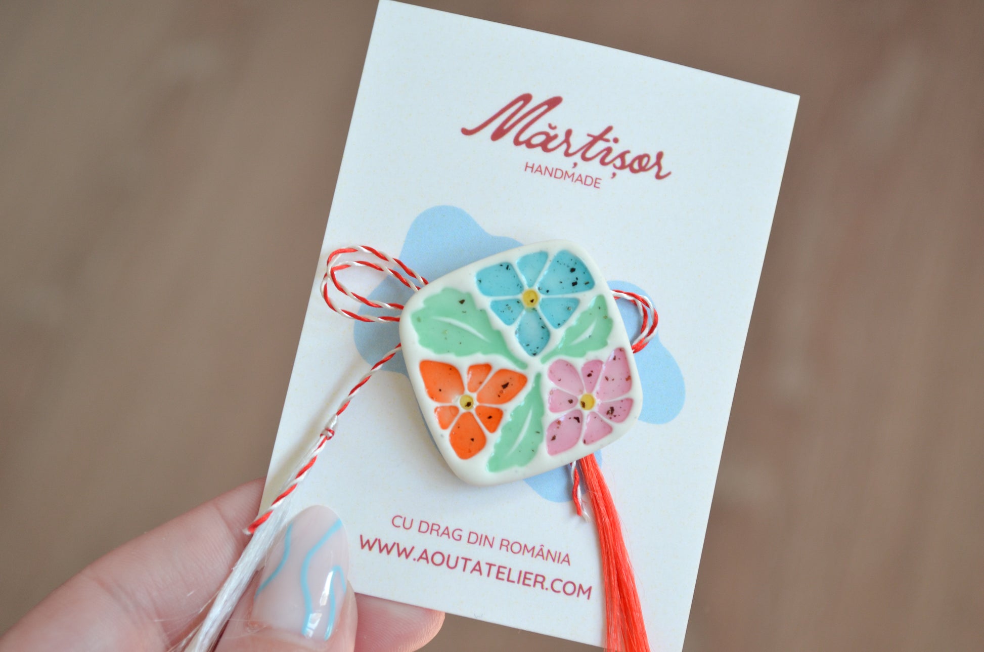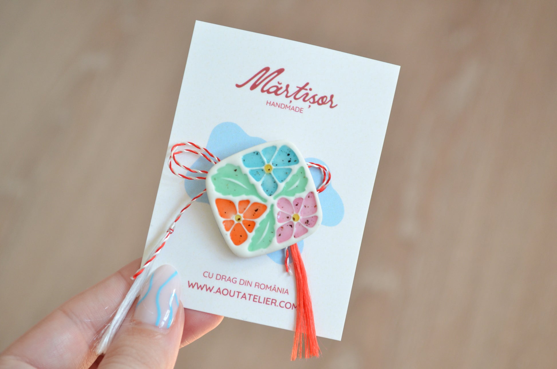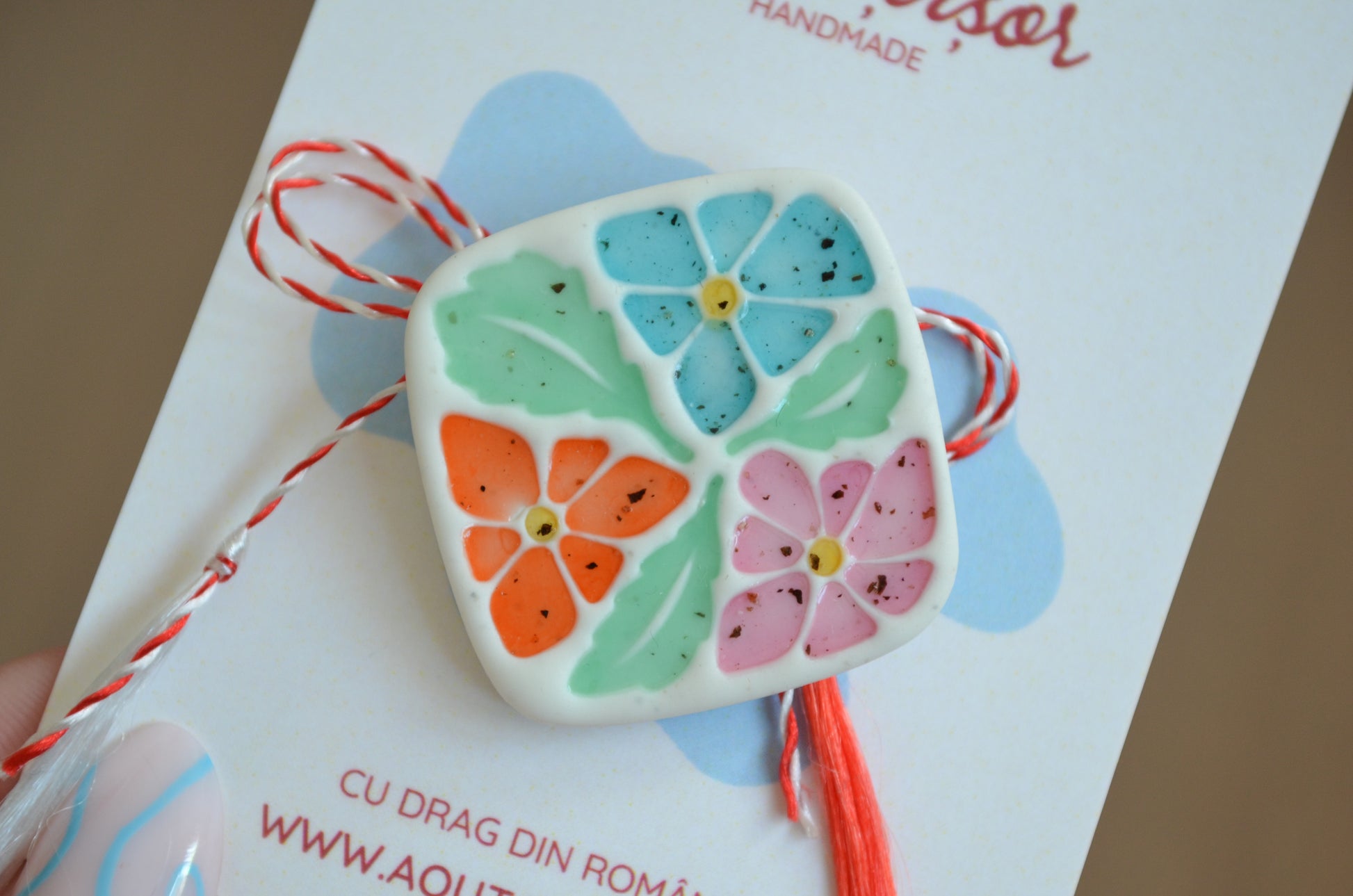 Broșă din lut polimeric, finisată cu rășină UV. Este prevăzută cu un ac din oțel inoxidabil, rezistent în timp. Aceasta vine cu o cartolină tematică și șnur de mărțișor.